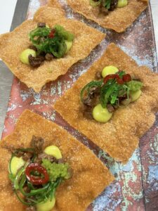 Syltede Mørbrad på wonton marts 13, 2025 | Ingen kommentarer Syltede Mørbrad på Wonton, wasabi mayo, wakame tang og chili